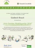 Die Deutsche Umwelthilfe hat im Rahmen des Projektes „Grünflächen in der Sozialen Stadt“ Gladbeck-Brauck für die Renaturierung einer „Köttelbecke“ einhergehend mit der Anlage des Wassererlebnispfades „Unser Hahnenbach“ als „Grün-Soziales Modellquartier 2016“ ausgezeichnet.