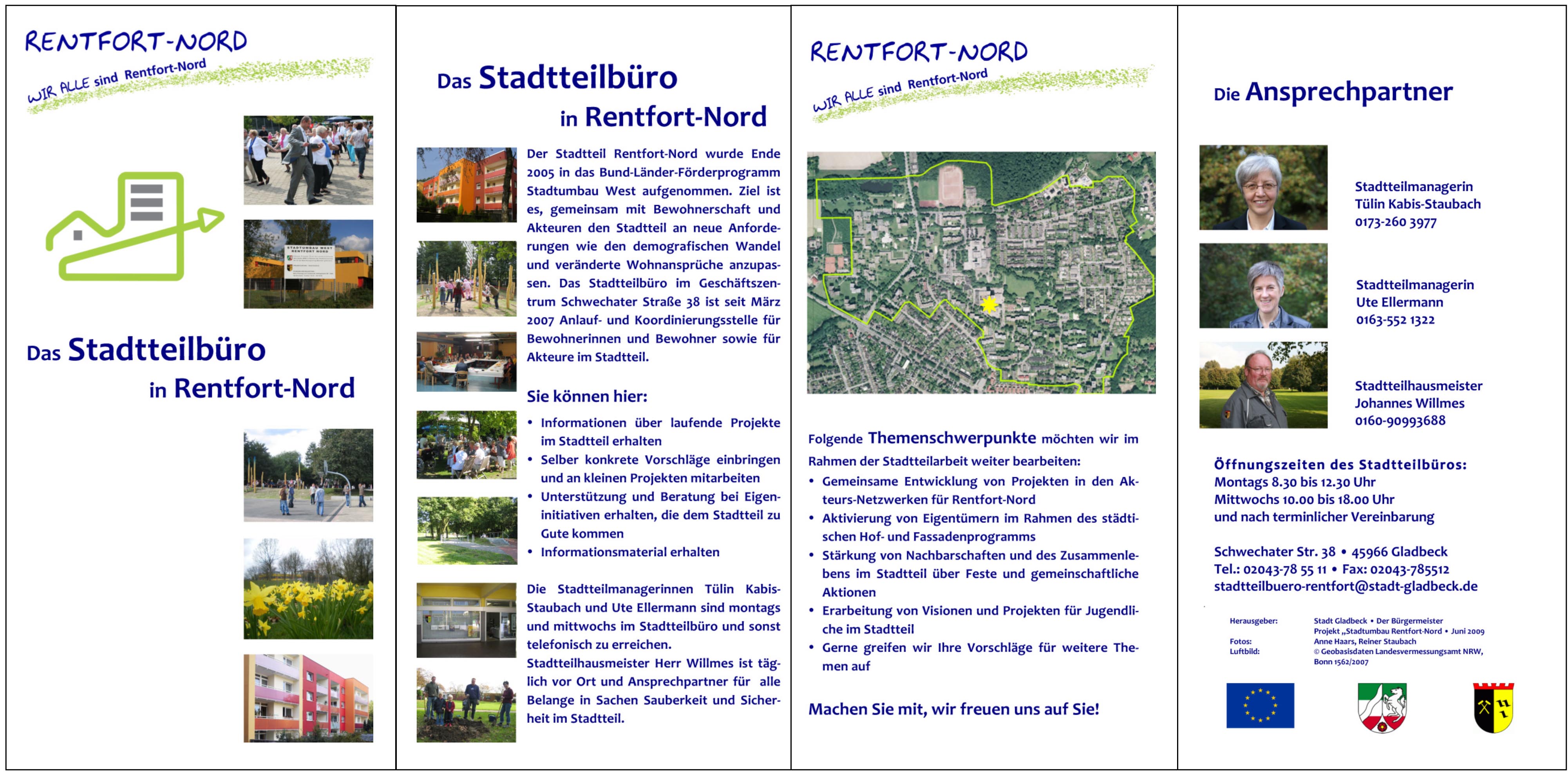 Ende 2005 ist der Stadtteil Rentfort-Nord in das Bund-Länder- Förderprogramm Stadtumbau West aufgenommen worden. Ziel ist es, gemeinsam mit Bewohnerschaft und Akteuren den Stadtteil an neue Anforderungen wie z.B. den Veränderungen in der Alterstruktur der Bewohnerschaft und veränderten Wohnansprüchen anzupassen. Das Stadtteilbüro ist Anlauf- und Koordinationsstelle im Stadtteil. Herzlich willkommen sind Bewohnerinnen und Bewohner, Geschäftsleute und Vertreter aus den Einrichtungen und Institutionen in Rentfort-Nord. Von hier aus werden Netzwerkstrukturen aufgebaut und erweitert, werden Bewohnergespräche mit Erwachsenen und Jugendlichen geführt und Ideen entwickelt und umgesetzt.