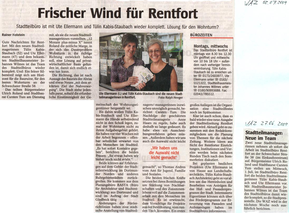 Mit neuem Schwung wird Anlauf genommen für die weitere Stadtteilentwicklung in Rentfort-Nord. Seit dem 1. Juni 2009 ist das Stadtteilbüro in der Schwechater Straße 38 mit Ute Ellermann und Tülin Kabis-Staubach des Planungsbüros BASTA neu besetzt. Bürgermeister Ulrich Roland und Stadtbaurat Carsten Tum stellten die beiden neuen Stadtteilmanagerinnen jetzt im Stadtteilbüro Rentfort-Nord vor.
