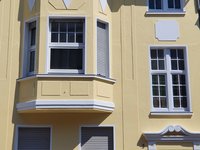 Wenige Meter weiter hat die Familie Bühne gleich zwei Häuser in Angriff genommen: Am eigenen Wohnhaus an der Bahnhofstraße 48 erfolgten ebenso Aufwertungsarbeiten wie in der Augustastraße 5, die ebenfalls der Familie gehört. In der Bahnhofstraße beschränkten sich Arbeiten auf die Rückseite des Gebäudes, die das öffentliche Straßenbild durch die Blickbeziehung zum Spielplatz an der Kurfürstenstraße prägt. Die Fassade zeigt sich nun in einem zurückhaltenden Rot-Braun, während Fensterlaibungen und Anbauteile wie etwa Balkongeländer ein frisches Weiß erhielten. „In der Augustastraße 5 haben wir die gesamte straßenseitige Front neu streichen lassen“, erläutern die Eigentümer. „Abgesehen vom grauen Sockel und ebenfalls weiß abgesetzten Fensterlaibungen und Dekorelementen wurde das vorhandene Gelb erneuert. Durch einen etwas kräftigeren Farbton entsteht jetzt ein wenig mehr Kontrast als zuvor“, zeigen sie sich mit dem Ergebnis zufrieden. Die beiden Häuser aus den Baujahren 1912 (Augustastraße) und 1909 (Bahnhofstraße) sind nun weitere Bereicherungen in Uerdingens vielfältigem Architektur-Schmuckkästchen.
