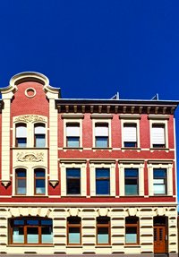 Den Anfang machte die Hohenbudberger Straße 23. Vis-à-vis der ehemaligen Weinbrennerei Dujardin gelegen und von alten Speditionsgebäuden umgeben, erstrahlt das 1905 erbaute Wohnhaus nun in neuem Glanz. Der Eigentümerin war es dabei wichtig, die markante Fassadengliederung hervorzuheben und diese durch farbliches Absetzen zu unterstreichen. Dafür hat sie einen dezenten Sandton als Kontrast zu den Klinkerflächen gewählt. „Ebenso wie den dunkelroten Klinker haben wir die Schmuckelemente, das Zierband und die Stuckköpfe unter dem Dach entsprechend aufarbeiten lassen, so dass sich ein stimmiges Gesamtbild ergibt. Dafür ist der Klinker so behandelt worden, dass er die leuchtende Farbe möglichst lange behält“, erläutert die Eigentümerin. Dabei liegt es ihr besonders am Herzen, etwas zur Verschönerung des Stadtbilds beizutragen, denn sie fühlt sich als Eigentümerin ihrem Stadtteil verpflichtet.