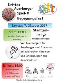 Das trübe Herbstwetter tat der Stimmung keinen Abbruch: Über 350 begeisterte Kinder und 18 Vereine und Einrichtungen nahmen am Samstag, dem 7. Oktober 2017 am 3. Auerberger Spiel- und Begegnungsfest teil. „Wir wollten die Kinder in Auerberg einladen, ihre Umgebung spielerisch zu erkunden. Bei den Mitmachaktionen können sie viel über die Angebote der Einrichtungen und Vereine in Auerberg erfahren“, erklärte Beate Eisenberg vom Stadtteil-Arbeitskreis Auerberg, der das Begegnungsfest organisiert hat, dass dann gemeinsam mit der Stadt Bonn veranstaltet wurde.