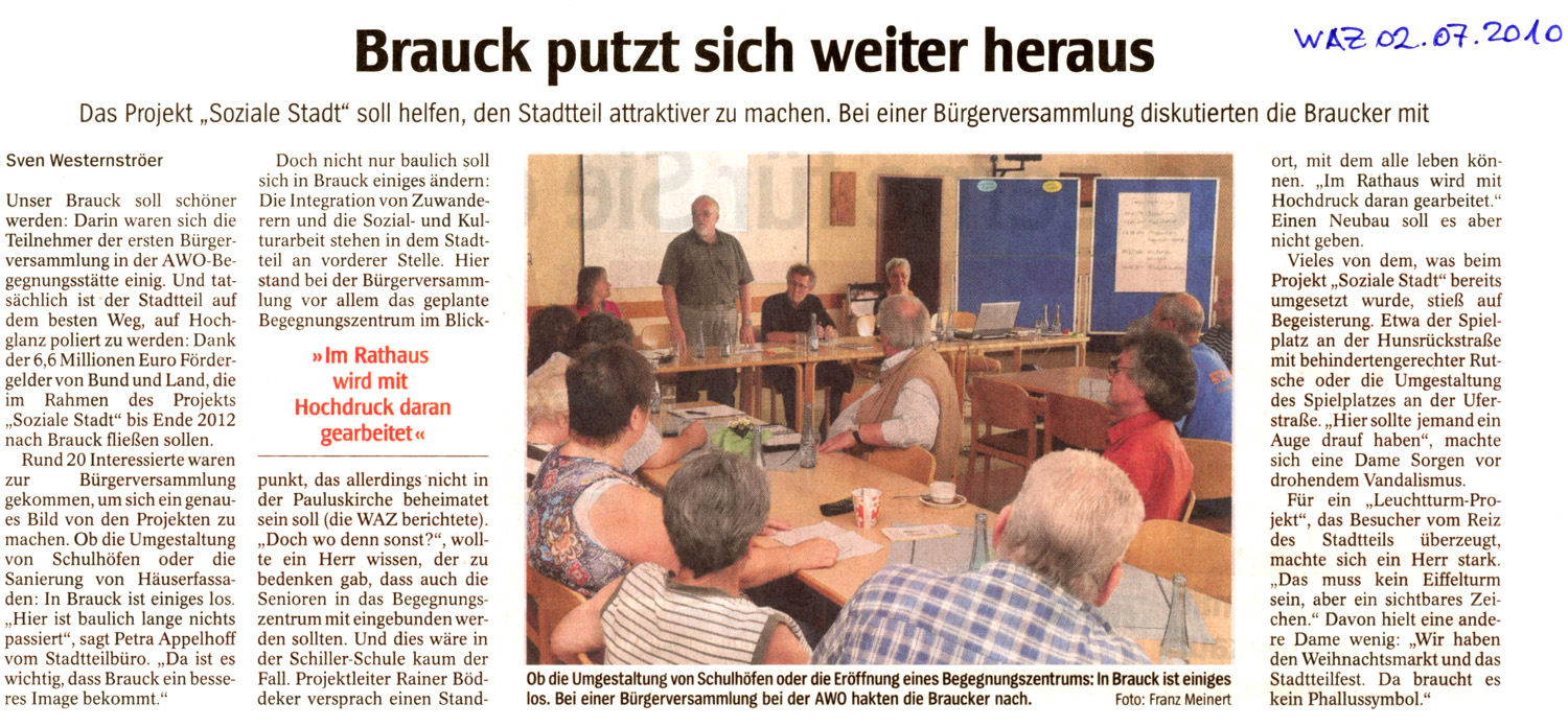 Am 30.06.2010 wurde außerdem zu einer öffentlichen Veranstaltung eingeladen, im Rahmen derer auch die Braucker Bewohner ihre Einschätzung zu den Projekten abgeben konnten. Natürlich stand hier auch die Verwaltung für Rückfragen zur Verfügung.