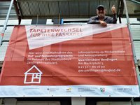 „Dabei soll das dezente Aussehen mit weißen Flächen und dunklen Akzenten am Sockel und den Fensterlaibungen beibehalten werden“, sagt Peter Achten. „Vor dem Neuanstrich müssen natürlich alte Farbschichten durch den Maler entfernt und kleinere Beschädigungen ausgebessert werden“, fasst er die Aufgabe der Handwerker zusammen. „Dabei ist es auch wichtig, mit welchen Werkstoffen gearbeitet wird“, so Regina Hermanns vom Quartiersbüro, das Antragstellerinnen und Antragsteller in allen Fragen berät. „Bei den geförderten Gebäuden sollte nach Möglichkeit mit mineralischen, diffusionsoffenen Farben gearbeitet werden“, ergänzt ihr Kollege Dennis Zilske. Nach Abschluss der Arbeiten wird die Alte Krefelder Straße 25 also nicht nur besser aussehen, sondern auch nachhaltig geschützt sein.