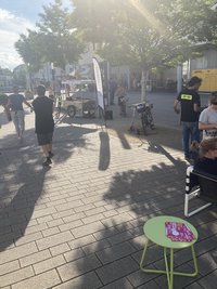Nach dem Spiel- und Begegnungsfest lud die Nachbarschaftsinitiative Stäbchenstelle die Eltern ein, auf der Auerberger Mitte zu verweilen. Mithilfe von Mitteln aus dem Quartiersfonds engagierten sie das Soundbike, ein Lastenfahrrad mit mobilem DJ-Pult, und verwandelten den Platz mit Gartenmöbeln in eine Lounge. Das Event wurde durch selbstgemachte Statement-Buttons mit Bezug zum Stadtteil abgerundet.