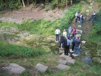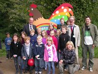 Die Stadtteilmanagerinnen Tülin Kabis-Staubach und Regina Hermanns haben den Prozess begleitet, Bürgerbeteiligungen zum Erlebnispfad organisiert, sei es im Rahmen des Stadtteilfestes auf der Suche nach dem Hahnsymbol, das nun in Form von Stelen den Bachlauf säumt, oder nach Sprüchen zum Thema Wasser für die Station „Wasser wispert Worte“, die in Form einer Zitatenterrasse ausgebildet worden ist. Außerdem haben sie Einrichtungen aus dem Stadtteil angesprochen und das Interesse an einer Bachpatenschaft abgefragt. Der letzte Beteiligungsschritt erfolgte in den Sommerferien, in dem zusammen mit Kindern und Jugendlichen der Teestube Motive für die künstlerische Gestaltung der Hahnsymbole gesucht wurden.