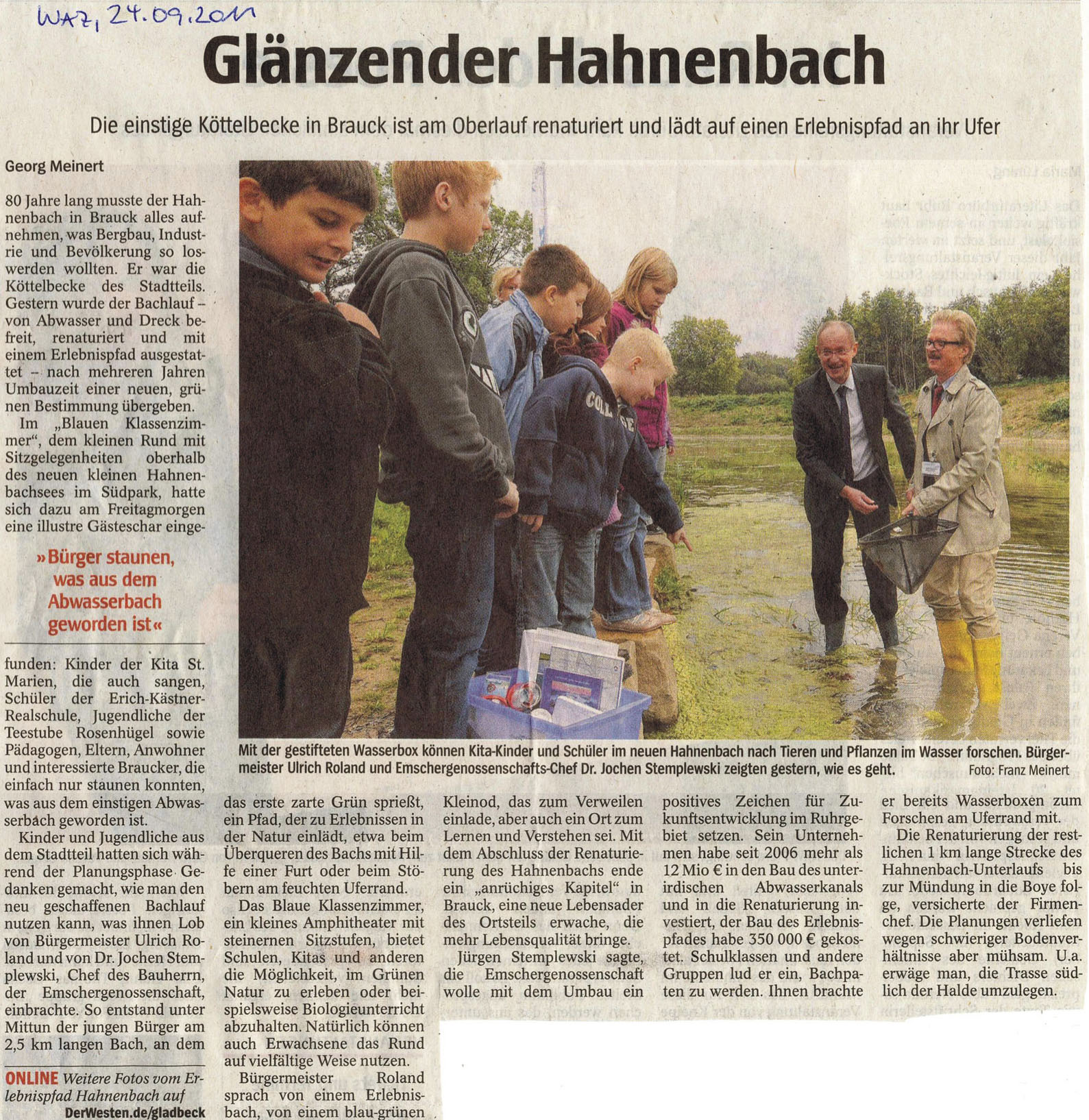 „Mit dem Erlebnispfad Unser Hahnenbach machen wir das Ergebnis unserer naturnahen Gewässer-Umgestaltung für die Bürginnen und Bürger in Gladbeck sichtbar. Dabei wurde besonders an die Schulen gedacht, die mit dem Blauen Klassenzimmer eine Unterrichtsstätte unter freiem Himmel erhalten“, erläuterte Dr. Jochen Stemplewski, Vorstandsvorsitzender der EMSCHERGENOSSENSCHAFT das neue Gewässer, das er zusammen mit Gladbecks Bürgermeister Ulrich Roland seiner Bestimmung übergab.