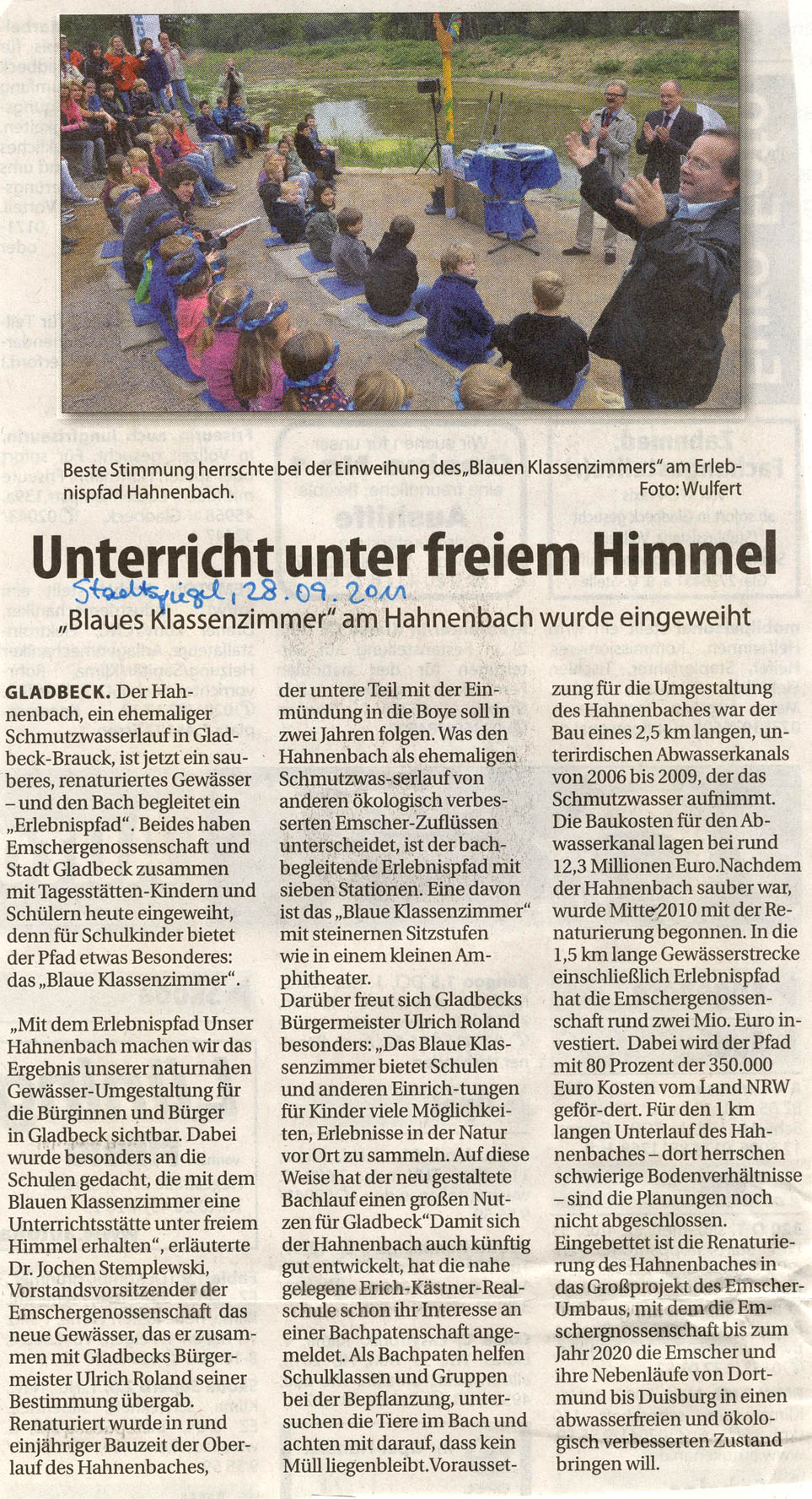 Über das „Blaue Klassenzimmer“ freut sich Gladbecks Bürgermeister besonders: „Das Blaue Klassenzimmer bietet Schulen und anderen Einrichtungen für Kinder viele Möglichkeiten, Erlebnisse in der Natur vor Ort zu sammeln. Auf diese Weise hat der neu gestaltete Bachlauf einen großen Nutzen für Gladbeck“.