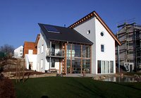 Im Juli wurde das freistehende Einfamilienhaus an der Dortmunder Stadtkrone-Ost fertig gestellt. Mit dem Bau des von BASTA als "Haus am Hang" entworfenen Gebäudes war im Oktober 2001 begonnen worden. Auf 2 1/2 Etagen verfügt es über 180 Quadratmeter Wohnfläche. In den unter dem ausgebauten Dach gelegenen Kinderzimmern finden sich Galerien. Die Ausführung erfolgte als Niedrigenergiehaus mit Mauerwerksbau im Wärmedämmverbundsystem. Die Holzkonstruktion des Pultdaches wurde in der Dachschräge gedämmt. Um möglichst sparsam mit Energie und Wasser umzugehen speisen Sonnenkollektoren die solarunterstützte Fußbodenheizung. Für WC und Waschmaschine wird Regenwasser genutzt.