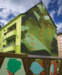 Die erste westliche Beschreibung des Ginkgos stammt von Engelbert Kaempfer, der während seines Aufenthaltes in Japan (1690 bis 1691) die japanische Pflanzenwelt erforschte und sein Material in dem 1712 in Lemgo gedruckten Werk «Amoenitates exoticarum» publik machte. Zum Bekanntheitsgrad des Ginkgos in Deutschland hat das Gedicht «Gingo biloba» beigetragen, das Goethe 1815 schrieb und 1819 in seiner Sammlung «West-östlicher diwan» veröffentlichte. Zur Mythenbildung hat die Geschichte eines Ginkgobaumes in Hiroshima beigetragen, der bei der Atombombenexplosion 1945 in Flammen aufging und im selben Jahr wieder austrieb und weiterlebte. Die Nordfassade zieren zahlreiche andere Namen für den Ginkgobaum («Beseeltes Ei», «Elefantenohrbaum», «Entenfußbaum» etc.) und zwei stilisierte Ginkgoblätter. Auf den 21 Garagen wurde das Wort Oesterholzwaldmalerei in Form eines von Schülerinnen der Oesterholzgrundschule geschaffenen Baumalphabetes und einer Geheimschrift umgesetzt. Der Entwurf «...Oesterholzwaldmalerei» wurde von Alexandra und Ulrich Perchner sowie Peter Michalke künstlerisch umgesetzt.