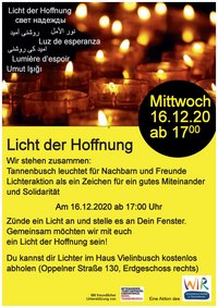 In Kooperation mit dem AK Vielfalt fand eine Lichteraktion unter dem Motto „Licht der Hoffnung“ statt. Hierbei wurden am 16.12.2020 die Bewohner*innen aufgefordert, ihr Fenster zu schmücken und zu beleuchten, um ein Zeichen der Gemeinsamkeit in dieser Zeit zu setzen.