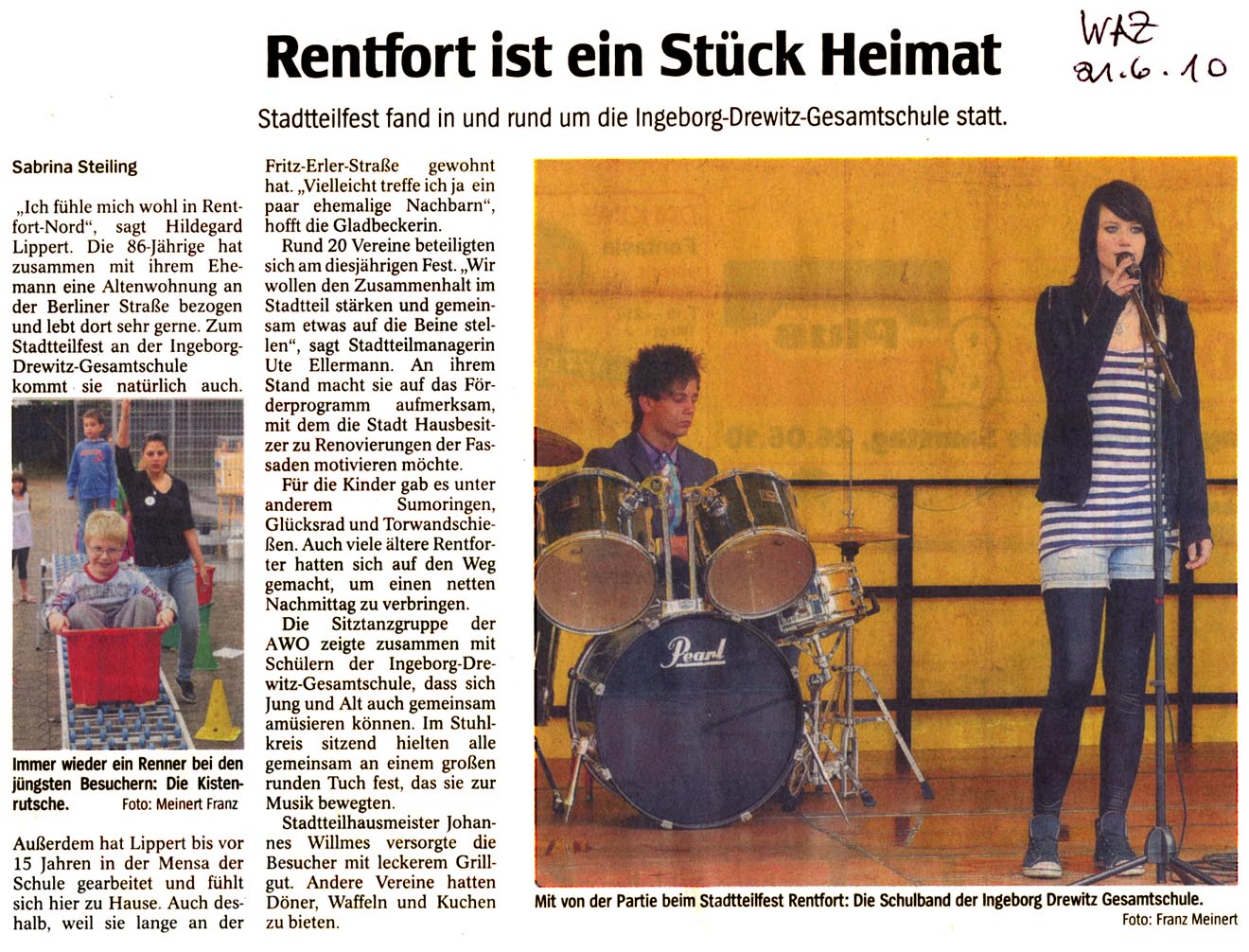 „Rentfort ist ein Stück Heimat“: Jung und Alt begegneten sich am 19.06.2010 auf dem Gelände der Ingeborg-Drewitz-Gesamtschule und feiern gemeinsam ein Stadtteilfest, das im Kulturhauptstadtjahr die Bandbreite der kulturellen Vielfalt des Stadtteils aufzeigen will.