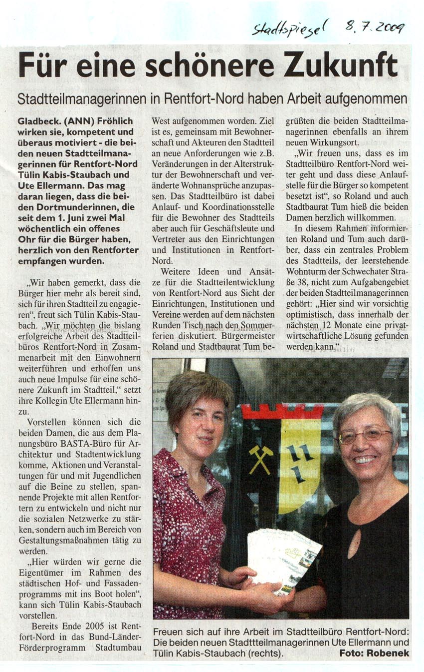 Mit neuem Schwung wird Anlauf genommen für die weitere Stadtteilentwicklung in Rentfort-Nord. Seit dem 1. Juni 2009 ist das Stadtteilbüro in der Schwechater Straße 38 mit Ute Ellermann und Tülin Kabis-Staubach des Planungsbüros BASTA neu besetzt. Bürgermeister Ulrich Roland und Stadtbaurat Carsten Tum stellten die beiden neuen Stadtteilmanagerinnen jetzt im Stadtteilbüro Rentfort-Nord vor.