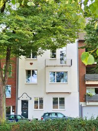 Den Anfang machte die Hohenbudberger Straße 23. Vis-à-vis der ehemaligen Weinbrennerei Dujardin gelegen und von alten Speditionsgebäuden umgeben, erstrahlt das 1905 erbaute Wohnhaus nun in neuem Glanz. Der Eigentümerin war es dabei wichtig, die markante Fassadengliederung hervorzuheben und diese durch farbliches Absetzen zu unterstreichen. Dafür hat sie einen dezenten Sandton als Kontrast zu den Klinkerflächen gewählt. „Ebenso wie den dunkelroten Klinker haben wir die Schmuckelemente, das Zierband und die Stuckköpfe unter dem Dach entsprechend aufarbeiten lassen, so dass sich ein stimmiges Gesamtbild ergibt. Dafür ist der Klinker so behandelt worden, dass er die leuchtende Farbe möglichst lange behält“, erläutert die Eigentümerin. Dabei liegt es ihr besonders am Herzen, etwas zur Verschönerung des Stadtbilds beizutragen, denn sie fühlt sich als Eigentümerin ihrem Stadtteil verpflichtet.