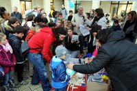 Am Stand des Quartiersmanagements bekamen die Kinder einen Stempel, wenn sie dem QM-Team ihre Lieblingsorte im Stadtteil verraten hatten. Gefragt war nach dem Wohnort, dem wichtigsten, dem schönsten und dem miesesten Ort. In einer 2 m x 2,5 m großen Stadtteilkarte konnten die Kinder Sterne an den entsprechenden Stellen kleben. Über hundert Kinder bewiesen exzellente Ortskenntnis und markierten mit den Aufklebern bestimmt ihre besonderen Orte im Auerberg. Das Ergebnis fließt mit in das derzeit in Aufstellung befindliche Integrierte Handlungskonzept (IEK). Der Befragung vorausgegangen war bereits eine Beteiligungsaktion im städtischen Jugendzentrum Auerberg mit älteren Kindern. Im nächsten Jahr ist darauf aufbauend eine Fortsetzung mit Jugendlichen im ev. Jugendzentrum geplant. Mit mindestens fünf Stempeln konnten alle Teilnehmer bei dem anschließenden Abschlussfest in der Auerberger Mitte tolle Preise gewinnen. Zahlreiche Stempelkarten wurden für die Tombola abgegeben, so dass die vielen tollen Preise, die von Banken und Unternehmen aus Auerberg und Graurheindorf gestiftet wurden, schnell verteilt waren. Ein herzliches Dankeschön an alle Spender.