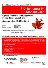 Die Arbeitsgruppe „Sauberkeit in Tannenbusch“ ist ein Zusammenschluss von Bewohnerinnen und Bewohnern, Eigentümerinnen und Eigentümern sowie der Stadt unter Koordination des Quartiersmanagements Neu-Tannenbusch und erarbeitet Lösungen, Vorschläge und konkrete Maßnahmen zur nachhaltigen Verbesserung des Erscheinungsbilds.