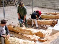 Eine ganz besondere Aktion vor allem für Jugendliche wurde in der letzten Aprilwoche durchgeführt: Der Holzbildhauer Gordon Brown aus Hamm erarbeitete mit den Jungen und Mädchen zusammen aus 50 cm dicken Baumstämmen Figuren unter dem Motto "Piraten".