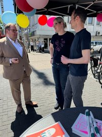 Unterdessen mischte sich das Team des Quartiersbüro an seinem Info-Pavillon vor den Herberzhäusern unter die Besucherinnen und Besucher des Frühlingsfestes, das mit verkaufsoffenem Sonntag, gastronomischen Angeboten und einer „Blaulichtmeile“ unter anderem mit Löschfahrzeugen der Feuerwehr sowie der Hundestaffel des THW aufwartete. So wurden neue Kontakte zur Bewohnerschaft geknüpft und auf die Angebote wie etwa das Hof- und Fassadenprogramm sowie den Verfügungsfonds aufmerksam gemacht. Auch Oberbürgermeister Frank Meyer besuchte das Team für einen Austausch über die aktuellen Themen der Bewohnerinnen und Bewohner in Sachen Stadtumbau.