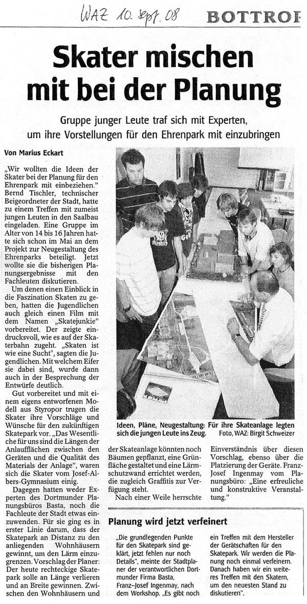 Am 08. September 2008 fand ein Planungsworkshop zur Skateranlage Ehrenpark statt, der während der Beteiligungswoche vom Technischen Beigeordneten Bernd Tischler bereits angekündigt worden war. Da die Skater sich sehr aktiv bei der Beteiligung eingebracht hatten und großes Interesse an einer weiteren Einbeziehung bei der Planung zeigten, wurde ein gemeinsamer Termin mit Vertretern der Stadtverwaltung und Streetworkern anberaumt. Den Skater bot sich so die Möglichkeit, ihre Wünsche und Vorstellungen zu präsentieren und mit den Fachleuten der Verwaltung gemeinsam weiterzuentwickeln. Nähere Informationen zum Planungsworkshop Skateranlage Ehrenpark finden Sie hier: Download Zeitungsartikel. BASTA hat die Moderation dieses Treffens übernommen.