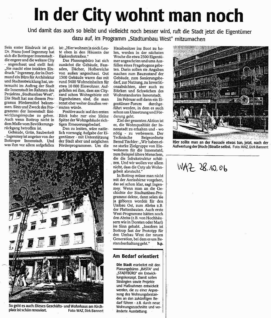 Mit Förderung aus dem Programm Stadtumbau West will die Stadt Bottrop für die Innenstadt ein Konzept zur Stärkung der Wohnfunktion entwickeln. Im Auftrag der Stadt wird BASTA dieses Konzept in Kooperation mit STADTBÜRO bis Mitte 2008 erarbeiten.