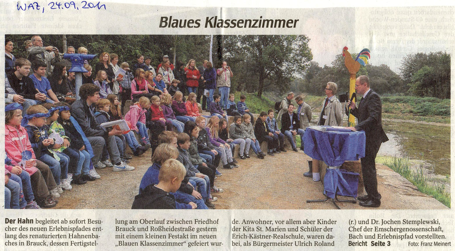 Über das „Blaue Klassenzimmer“ freut sich Gladbecks Bürgermeister besonders: „Das Blaue Klassenzimmer bietet Schulen und anderen Einrichtungen für Kinder viele Möglichkeiten, Erlebnisse in der Natur vor Ort zu sammeln. Auf diese Weise hat der neu gestaltete Bachlauf einen großen Nutzen für Gladbeck“.