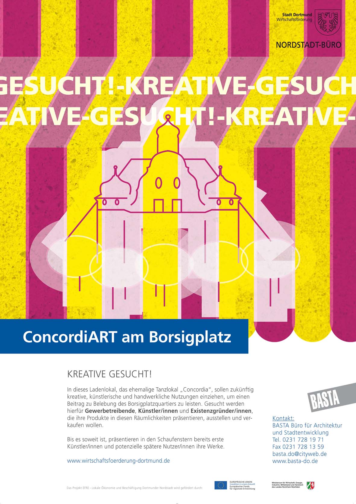 Im Rahmen unseres Projektes „Standortentwicklung NORD“ ist es uns gemeinsam mit dem NORDSTADT-BÜRO der Wirtschaftsförderung Dortmund gelungen, die Netzwerke der Existenzgründer sowie der Kunst- und Kulturschaffenden in der Nordstadt zu aktivieren. Besuchern und Passanten wird ein erster Eindruck ermöglicht, welche Angebotsvielfalt in das Concordia-Haus einziehen wird und welche Möglichkeiten sich mit diesem Modellprojekt Kreativen (Gewerbetreibenden, Handwerkern, Künstlern u.a.) im Quartier und in der gesamten Nordstadt eröffnen werden.