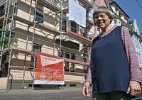 Die Hauseigentümerin freut sich über den Start der Fassadensanierung an ihrem Haus (Bildquelle: Stadt Krefeld, Presse und Kommunikation A. Bischof)