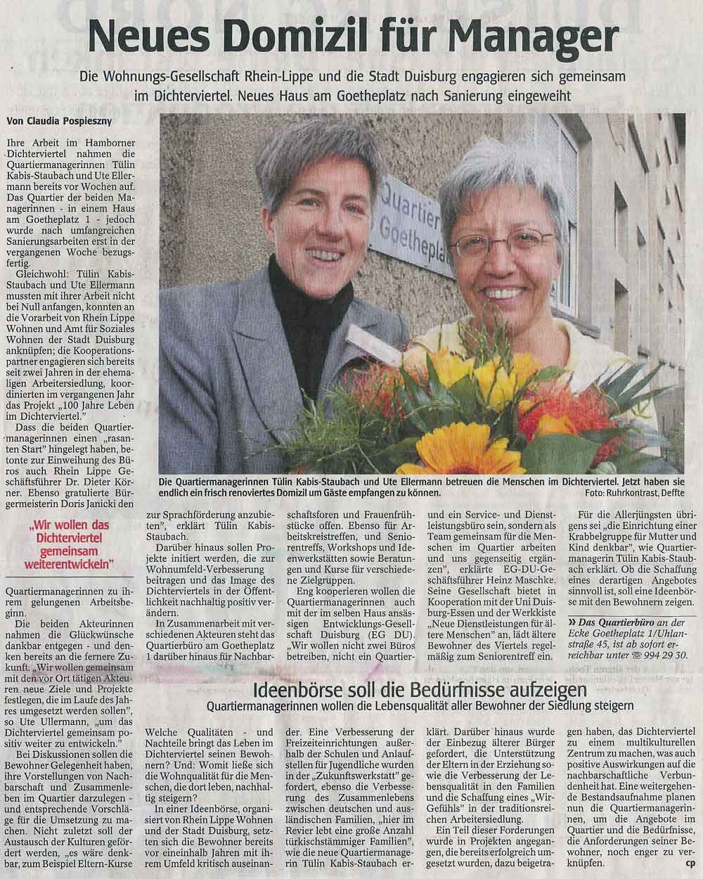 Mit Beginn des Jahres 2006 weht ein frischer Wind durch das Dichterviertel in Duisburg-Hamborn. Tülin Kabis-Staubach und Ute Ellermann vom Planungsbüro BASTA haben ihre Arbeit im Quartierbüro aufgenommen und schon erste Kontakte zu Akteuren aus dem Stadtteil geknüpft sowie erste Gespräche geführt. Am 2. März fand nun die offizielle Eröffnung im Quartierbüro am Goetheplatz 1 statt.