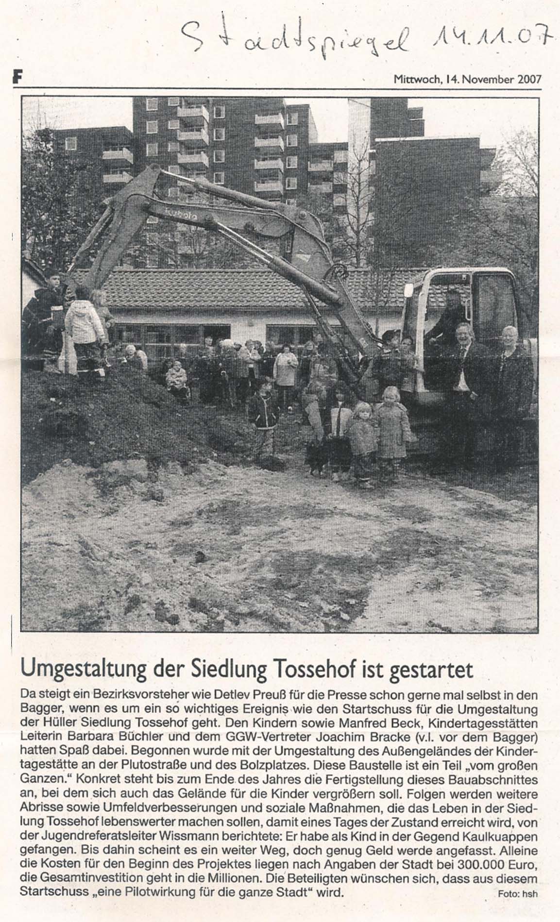 Im Oktober 2007 erfolgte der offizielle Auftakt für die Umsetzung von Stadterneuerungsmaßnahmen im Quartier Tossehof in Gelsenkirchen Bulmke-Hüllen. Als wichtiges Starterprojekt wurde die Neugestaltung der Außenanlagen an der städtischen Tageseinrichtung für Kinder Plutostraße einschließlich der Erneuerung der benachbarten Bolzplatzfläche mit Jugendtreff in Angriff genommen. Das Büro BASTA ist im Rahmen der von der Stadt Gelsenkirchen und dem zuständigen Stadtumbaubüro angestrebten baulichen und sozial-integrativen Maßnahmen seit Anfang 2007 mit der Planung und Objektüberwachung für die Neugestaltung der Freianlagen beauftragt.