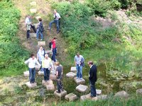 Vormittags fand ein Rundgang am Hahnenbach statt, auf dem dem Fachpublikum die sieben einzelnen Stationen, aber auch der Projektrahmen, die Planungs- und Umsetzungsschritte vorgestellt wurden. Ein großes Augenmerk wurde auf die Besonderheit des Projektes gelegt, und zwar die Kooperation der vielen Projektbeteiligten, angefangen bei der Emscher-genossenschaft, die für den ökologischen Umbau verantwortlich war, die Stadt Gladbeck, die bspw. gleichzeitig die Horster Straße, die den Bachlauf kreuzt, umgebaut hat, und das Planungsbüro, das mit der Ausführungsplanung des Erlebnispfades betraut war, sowie das Stadtteilmanagement, das die zahlreichen Beteiligungsschritte im Stadtteil begleitet hat – um nur die Hauptbeteiligten zu nennen.