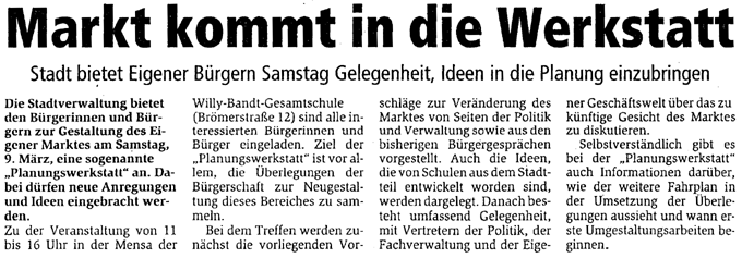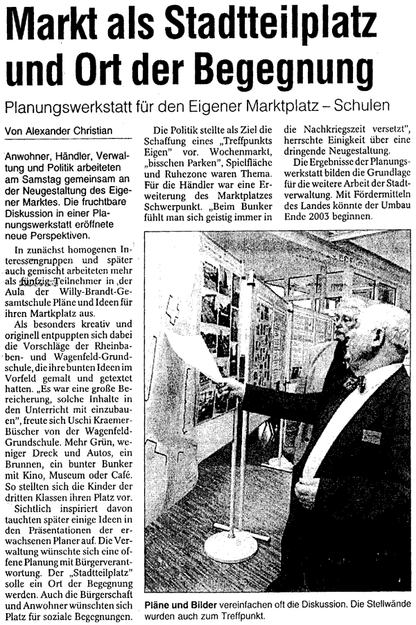 Eine Planungswerkstatt für interessierte Bürgerinnen und Bürger zur Umgestaltung des Marktplatzes in Bottrop-Eigen führte BASTA zusammen mit dem dem Büro Stadtbüro am 9. März 2002 durch.