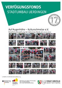 Im Rahmen des Herbst- und Weinfestes des Kaufmannsbundes wurd am 17. Oktober die inklusive Bank eingeweiht. Diese Bank ist ein gefördertes Projekt des Verfügungsfonds im Rahmen des Stadtumbaus Uerdingen. Der Fonds stellt Mittel für Projektideen von Bürgerinnen und Bürgern zur Verfügung. Der Verein Kulturschmelze Krefeld e.V. hat mit Beteiligung von Menschen mit Behinderung in Eigenarbeit eine Bank entworfen und gebaut, die das Thema Inklusion in Stadtteil und Bewohnerschaft präsenter machen soll.