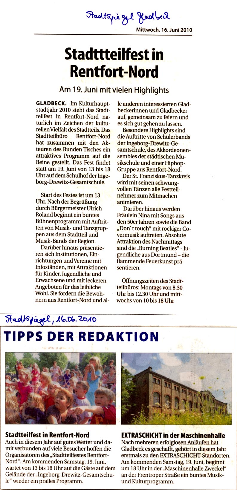 „Rentfort ist ein Stück Heimat“: Jung und Alt begegneten sich am 19.06.2010 auf dem Gelände der Ingeborg-Drewitz-Gesamtschule und feiern gemeinsam ein Stadtteilfest, das im Kulturhauptstadtjahr die Bandbreite der kulturellen Vielfalt des Stadtteils aufzeigen will.